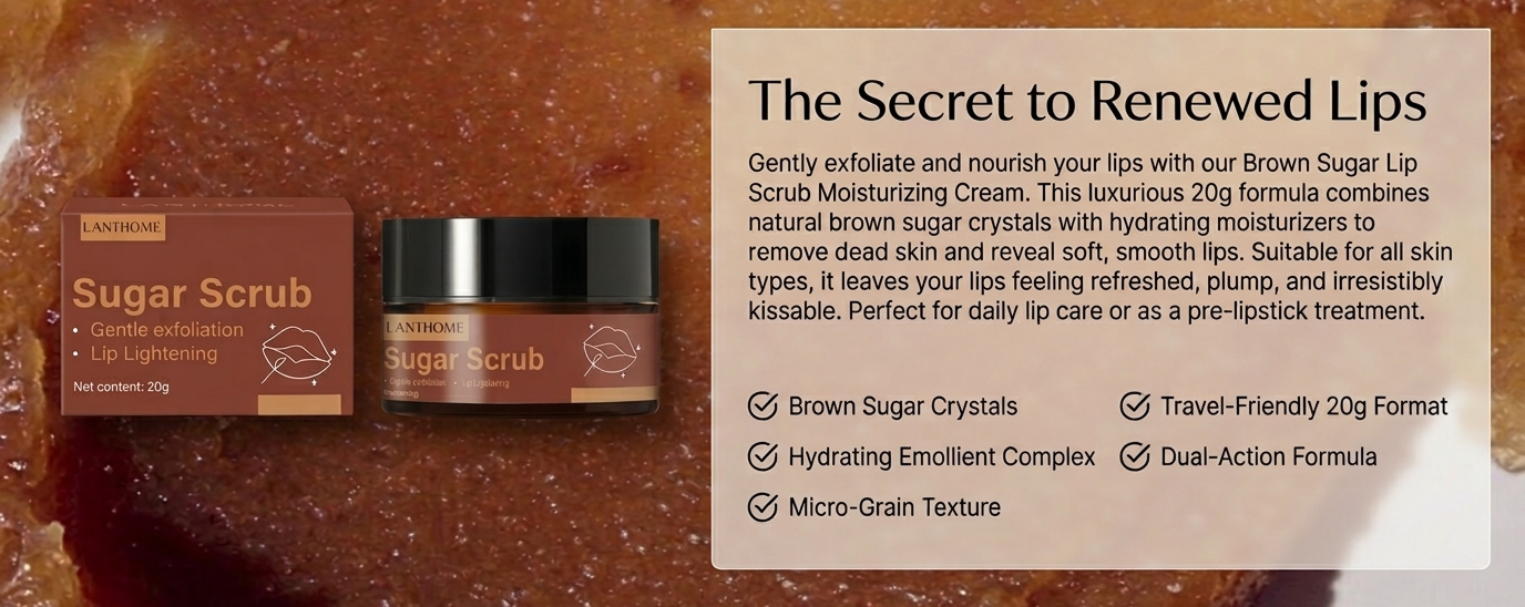 Organic brown sugar grains act as natural micro-polishers that gently dissolve as you massage. This prevents micro-tears on delicate lip skin while leaving a surface as smooth as silk.